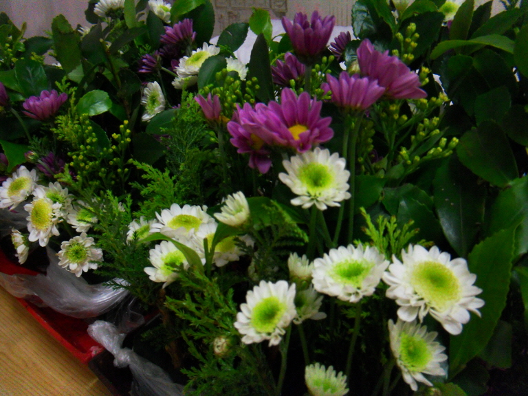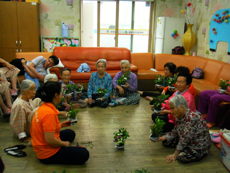 자주색과 하얀소국의 향기로 어르신들의 머리가 좀 더