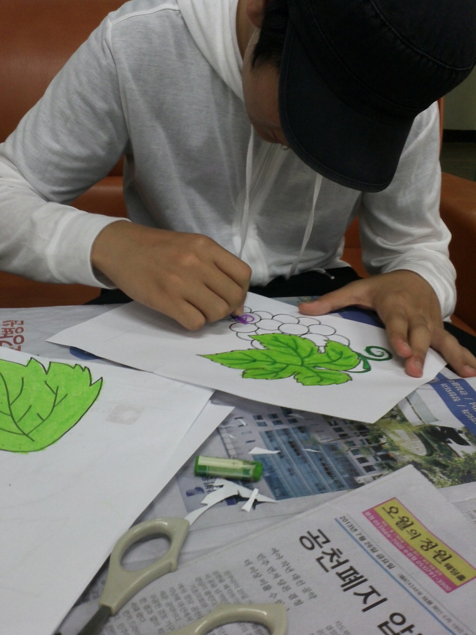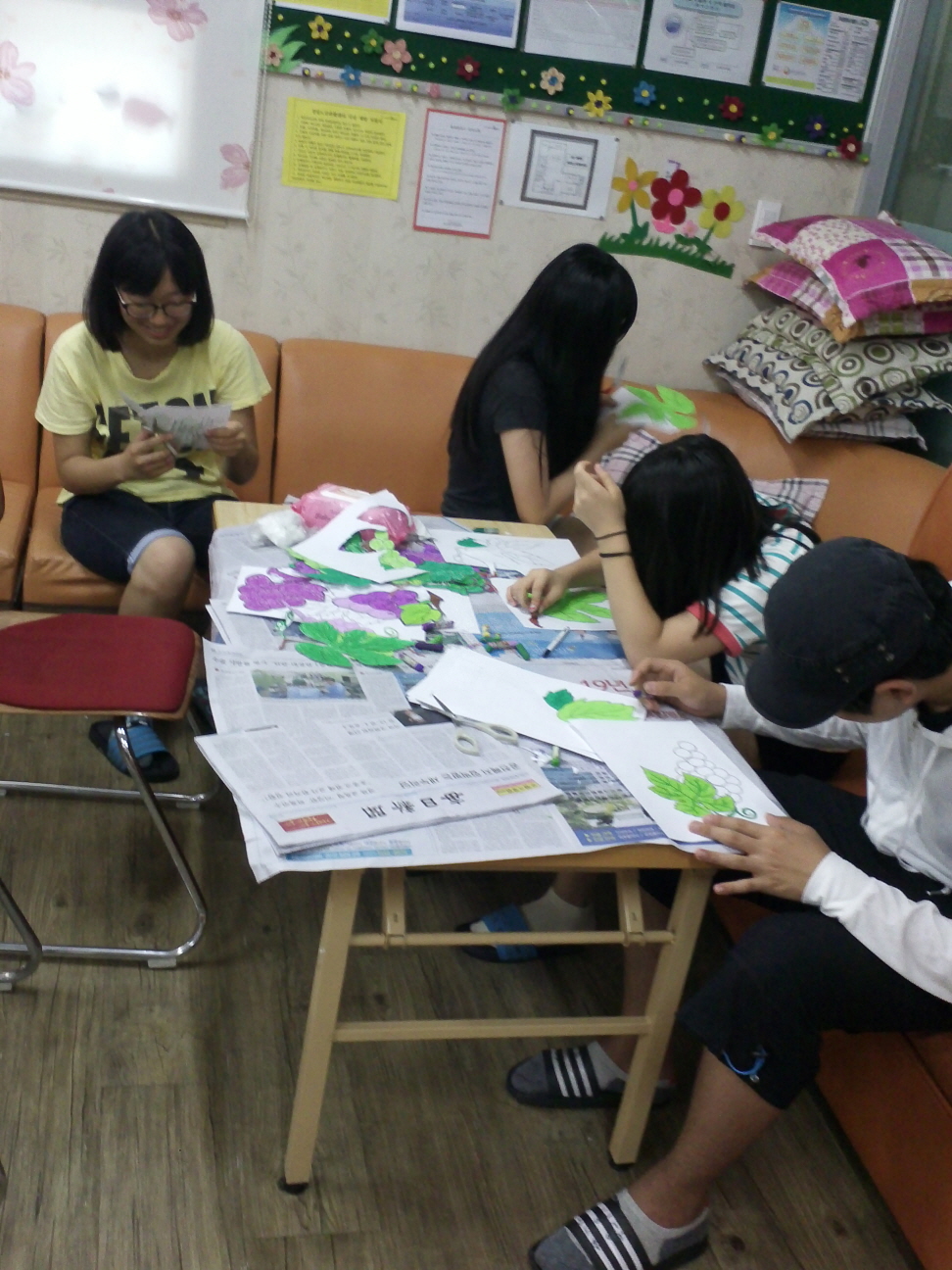 매주 토요일~ 상서중학교 학생들과 어머님이 봉사활동을 하러 온답니다~어머님들은 청소나 식사준비를 해주시고~ 학생들은 시설 내 환경개선을 위해 포도송이를 열심히 색칠하고 오려 주었어요^^