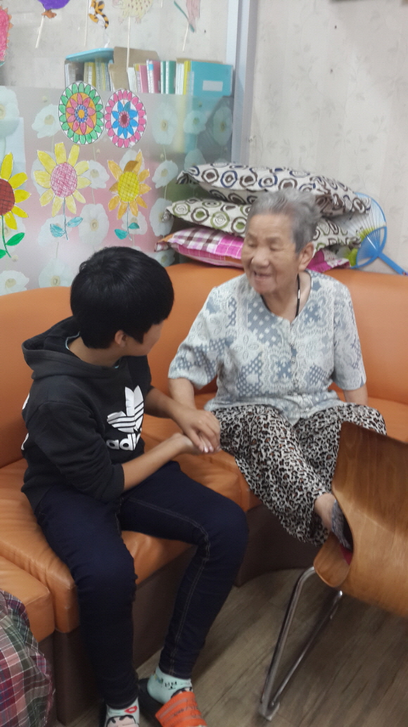 중학생 자원봉사자가 어르신 한 분 한 분의 손을 잡고 정성스레 마사지 해주었습니다.