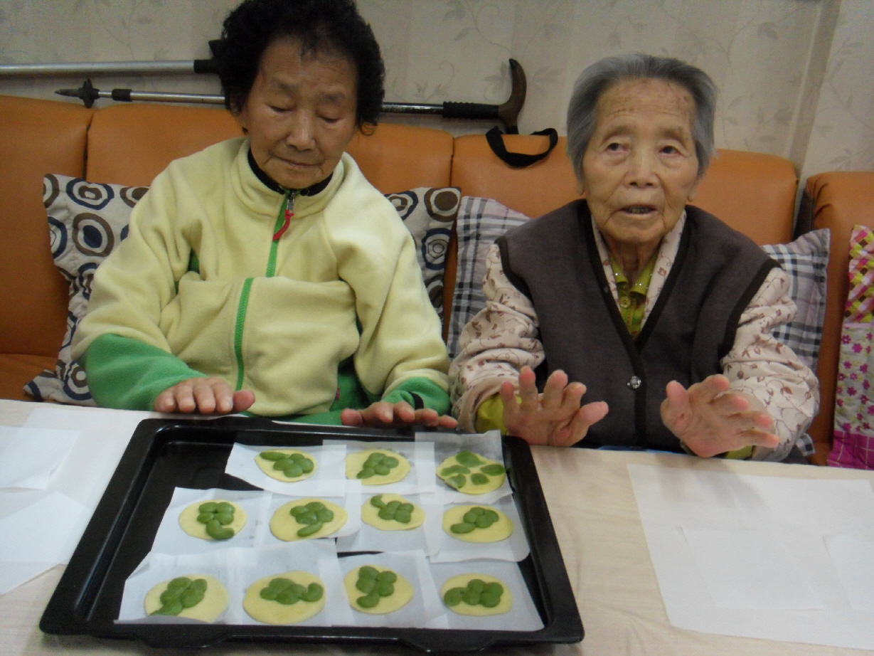 매끄러운 반죽으로 모양을 빚어 맛이 좋은 쿠키를 만드는 시간으로 어르신들께 아주 반가운 시간입니다.직접 빗고 구운 것을 바로 드실 수 있어 효과 만점의인기프로그램이지요~~!!!네잎클로버도 만들고 탐스러운 딸기도 만들어 드셨습니다.