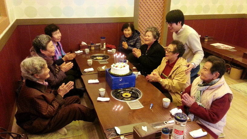 4/4분기 생신이신 재가 어르신들과 함께 생신잔치와 나들이를 다녀왔어요^^ 거동이 불편하시거나 다른 볼일로 생신잔치에 참석하지 못한 어르신들에게 간소하게나마 선물을 드렸습니다~ 어르신들이 너무고마워하셔서 저희도 뿌듯해지는 날 이었습니다^-^