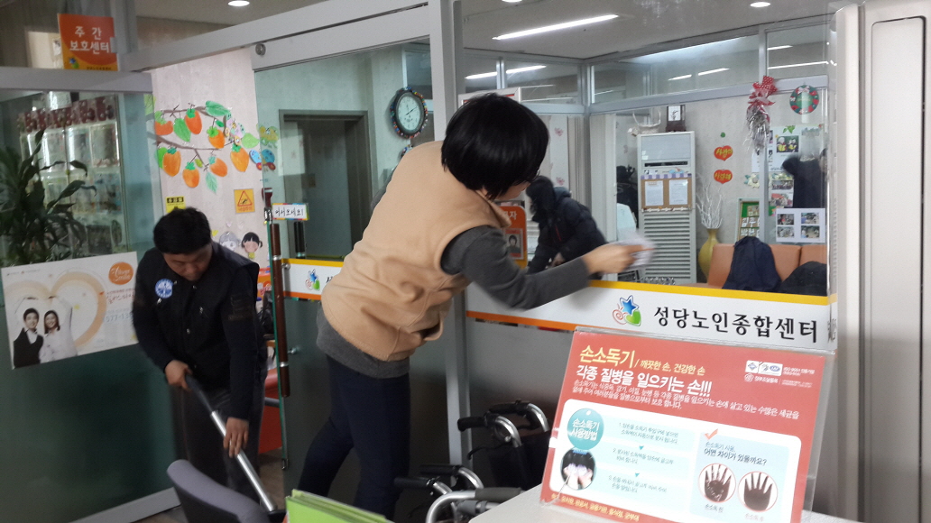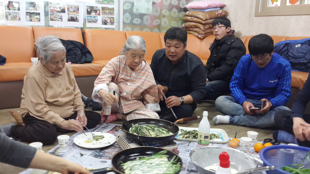 찬바람이 매서운 1월입니다. 금번 "써포터즈와 함께하는 어르신나들이"는 외출을 하지 않고, 센터내에서 프로그램을 진행하는 것으로 대체하였습니다~ 오전에는 어르신과 함께 요리프로그램(부추전굽기)을 하고, 오후에는 전 층 청소를 하였습니다. 부추전을 굽기 위해 부침가루를 반죽해놓으니, 후라이팬 앞으로 당겨앉아 직접 구워주셨어요~ 노릇노릇~ 맛있게 구워주셔서 눈도 즐겁고~ 입도 즐거웠답니다^^ 오후에 청소를 할 때에는 써포터즈 봉사단 분들이 각자의 역할에 최선을 다해주어 훨씬 깔끔한 분위기를 만들어주었지요~ 늘 감사합니다. 써포터즈 봉사단 여러분♥