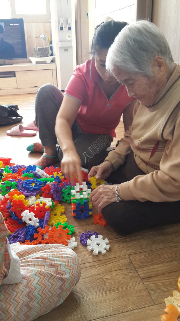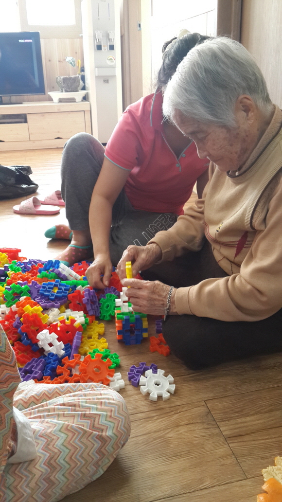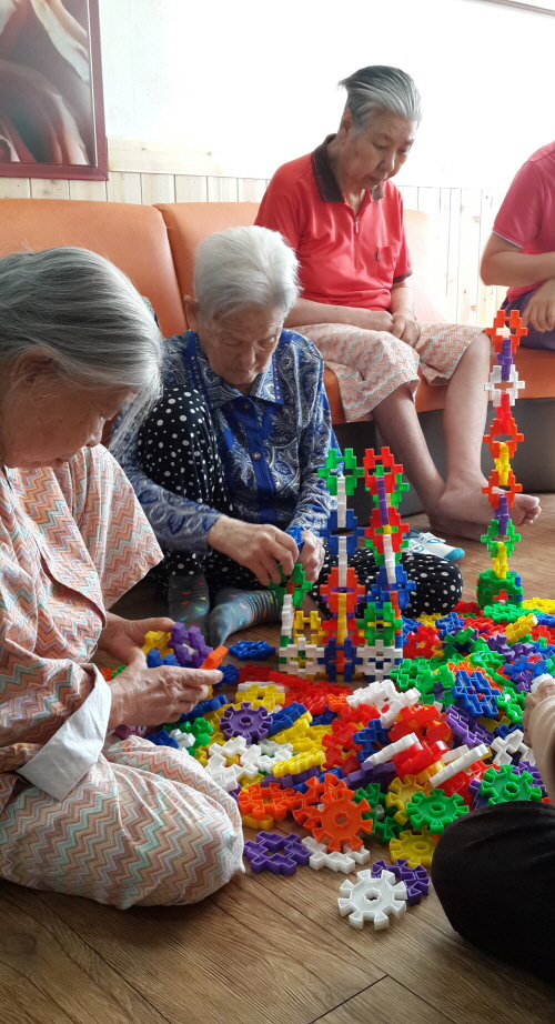 오늘 오후에는 어르신들이 옹기종기 모여앉아 블록쌓기를 합니다~