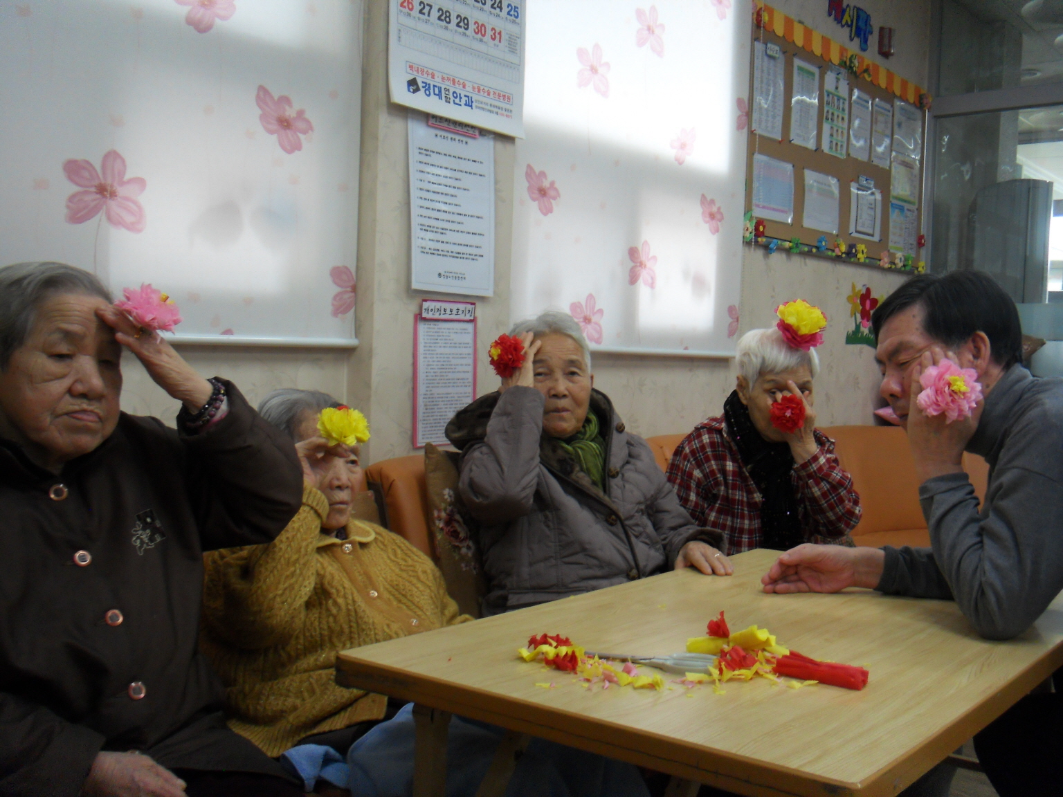 한지를 겹겹이 접고 오려 펴서 한지 꽃을 만들어 보았습니다.