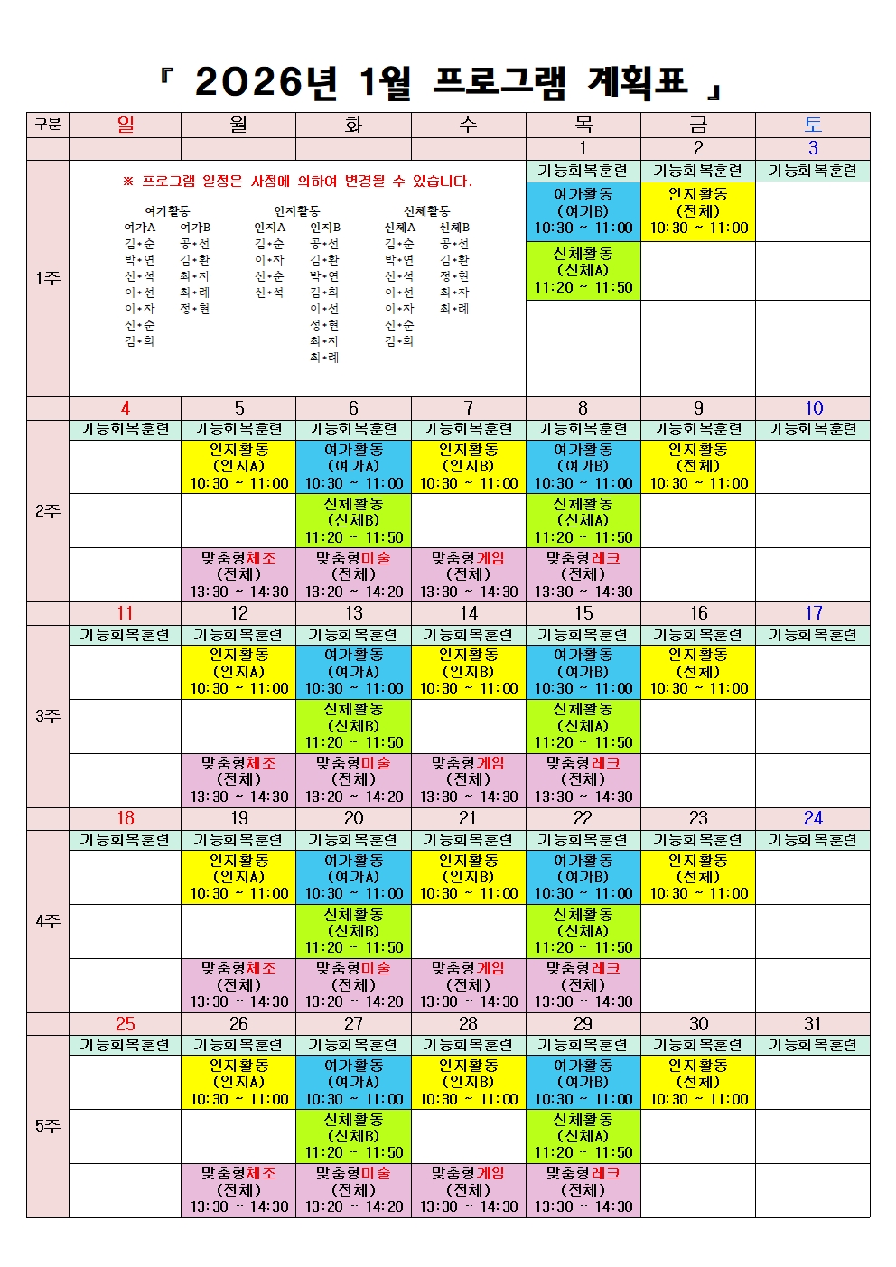 굿실버요양원 2026년 1월 프로그램표