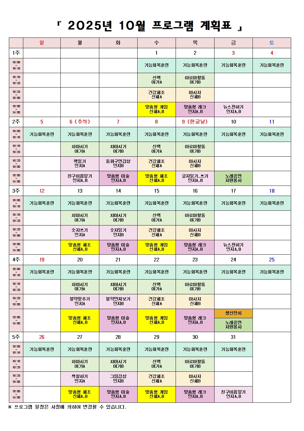 굿실버요양원 2025년 10월 프로그램표